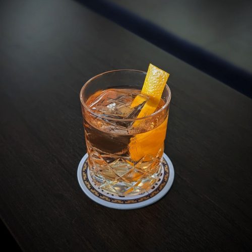 Stir 30-45 seconds and strain into a rocks glass over a large ice cube. Garnish with an orange peel.