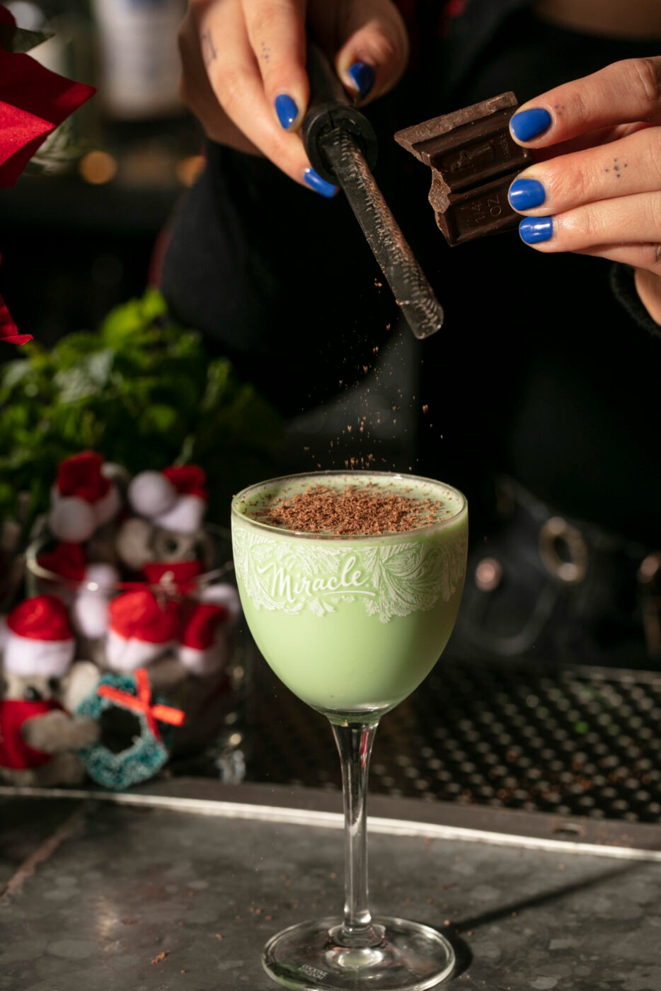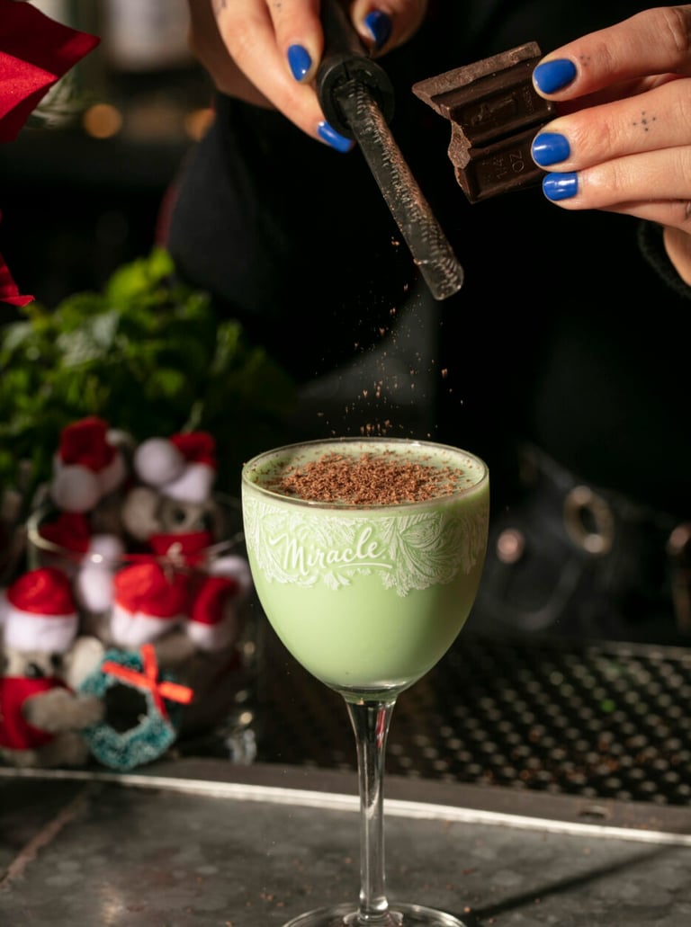 Shake 10-15 seconds with ice. Strain into a chilled coupe. Shave or grate dark chocolate bar for garnish.