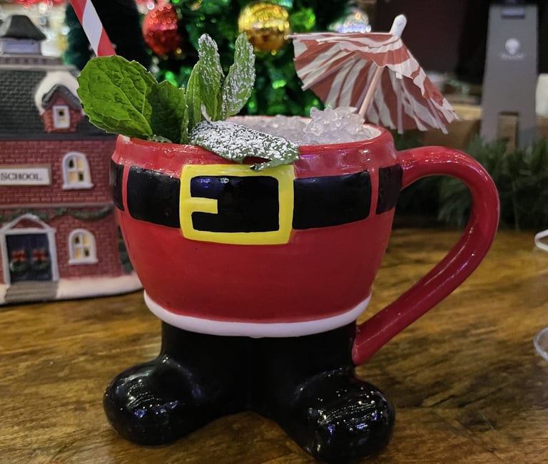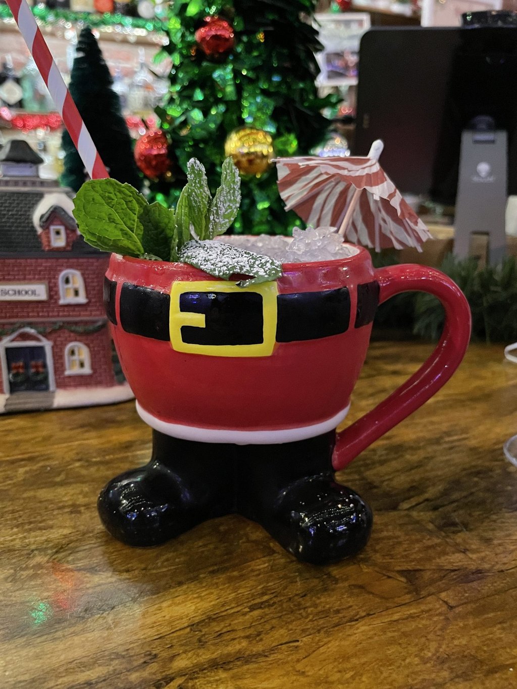 Whip shake with pebble ice until mostly gone. Pour into a Santa mug and top with pebble ice. Garnish with mint.