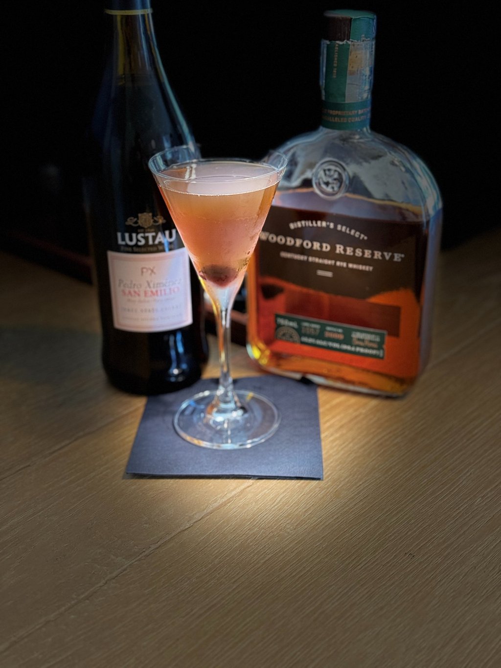 Stir 30-45 seconds. Strain into a chilled coupe. Drop a maraschino cherry into the bottom of the coupe.