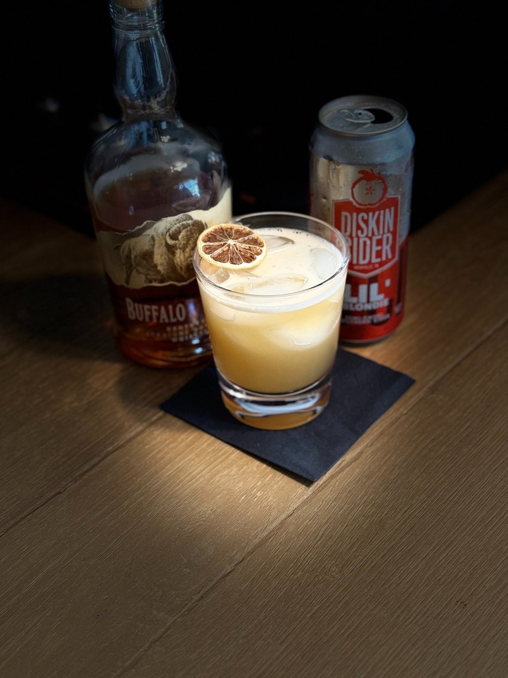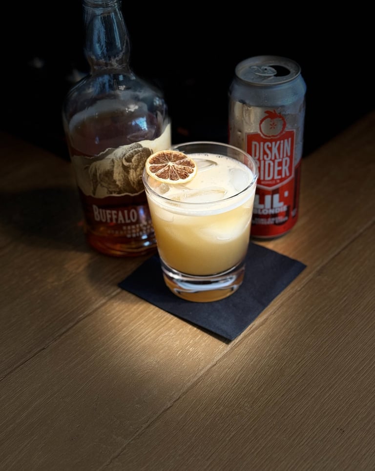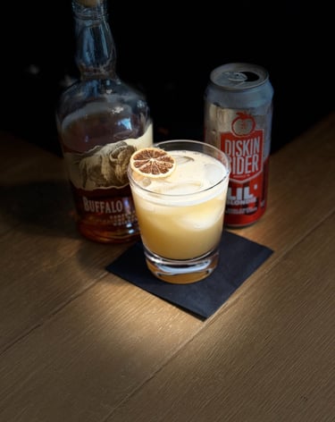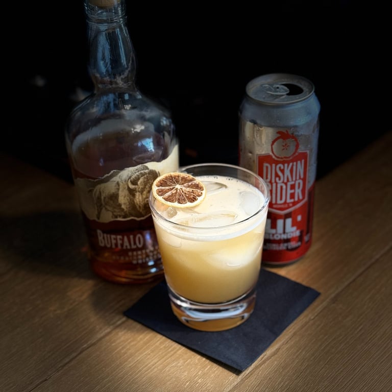 Shake for 10-15 seconds. Strain into a highball glass. Top with hard cider. Garnish with dehydrated lemon.