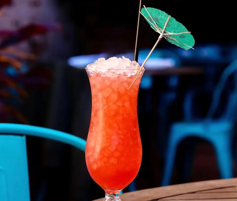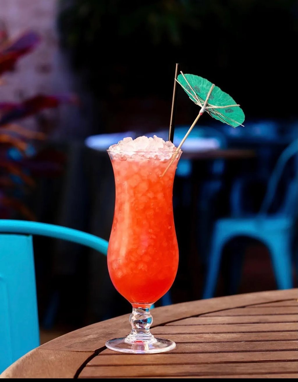 Whip shake with pebble ice until mostly gone. Pour into a hurricane glass and top with pebble ice. Garnish with cocktail umbrella and dehydrated orange.