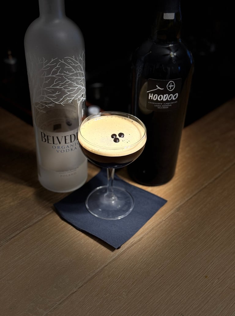 Shake 10-15 seconds. Strain into liquid into opposite tin and discard ice. Dry shake another 10-15 seconds. Pour into a chilled coupe. Garnish with 3 coffee beans.