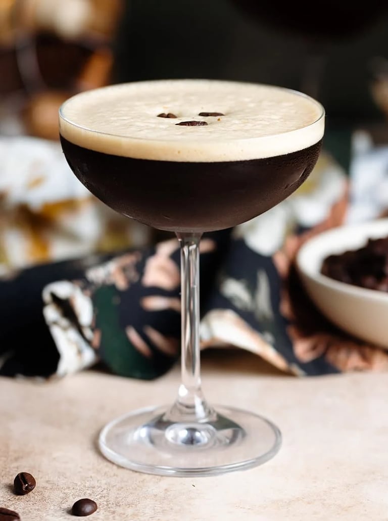Shake 10-15 seconds and strain ice out. Dry shake to build a foam and then strain into a chilled coupe. Garnish with 3 coffee beans.