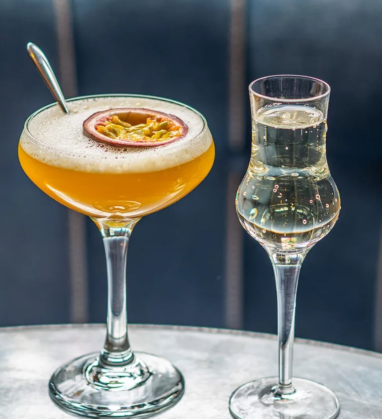 Shake 10-15 seconds and strain into a chilled coupe. Garnish with passionfruit (dried or fresh half) and a sidecar of sparkling wine.