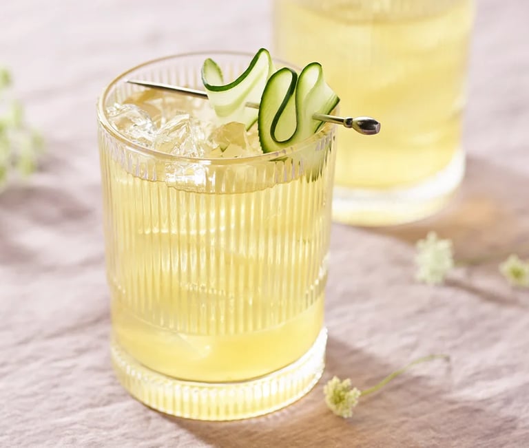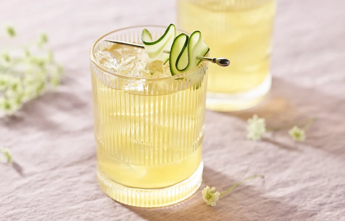 Shake 10-15 seconds and strain over fresh ice in a rocks glass. Garnish with cucumber slices.