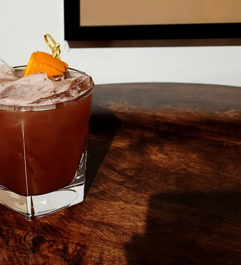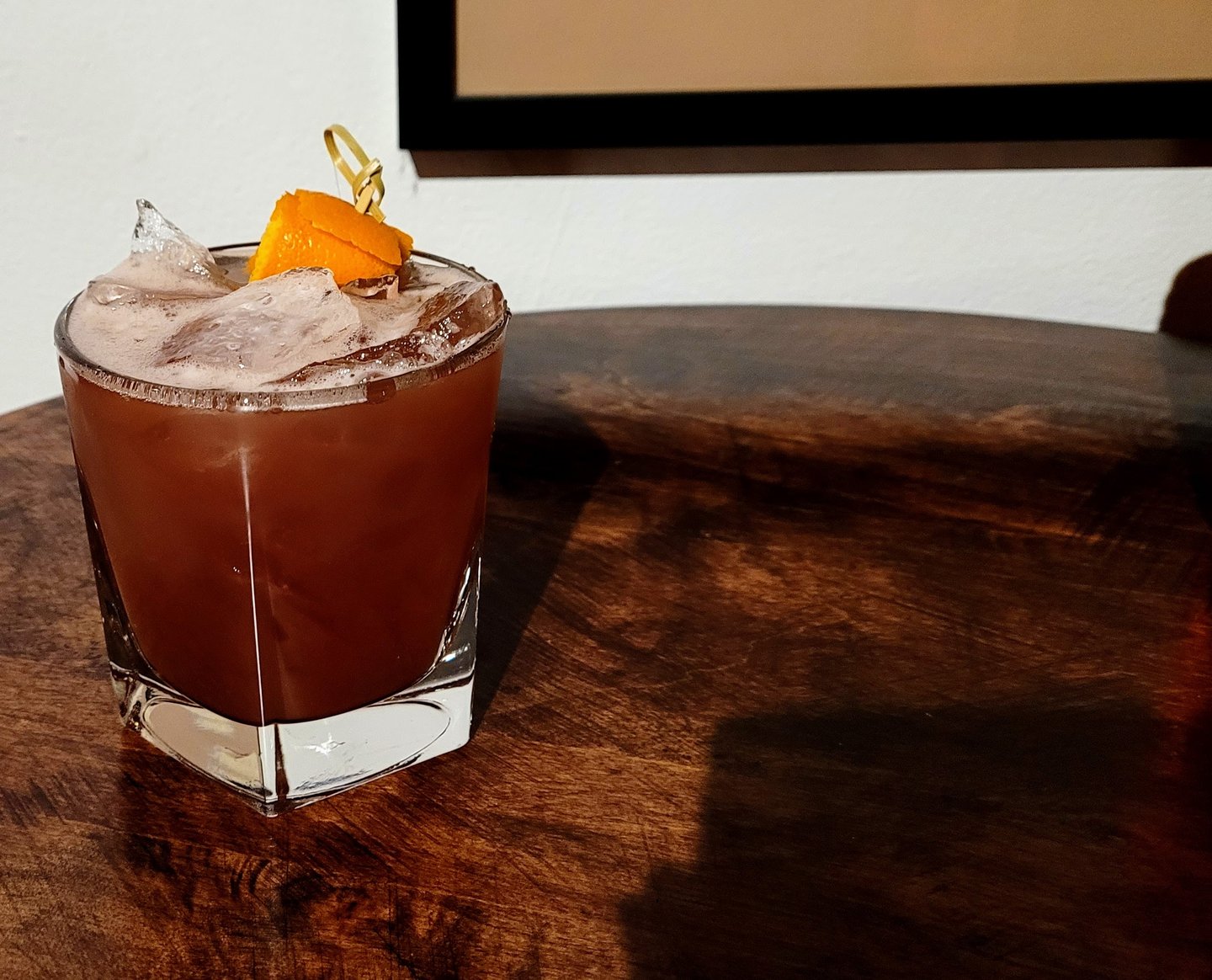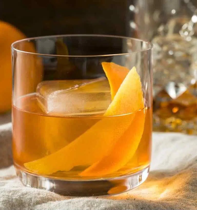 Stir 30-45 seconds. Strain into a rocks glass over a large format ice cube. Garnish with an orange peel.
